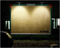 Per pubblicizzare la celebre rivista per adulti, è stato realizzato un 6×3 che se visto di giorno altro non è che un grande manifesto color oro che in basso a destra riporta il logo del noto coniglietto e la scritta ‘PlayBoy’ ma che, al calar della sera, quando il supporto viene illuminato grazie a degli anelli installati sui fari soprastanti, come per magia vede comparire proprio al centro un prosperoso decolté.